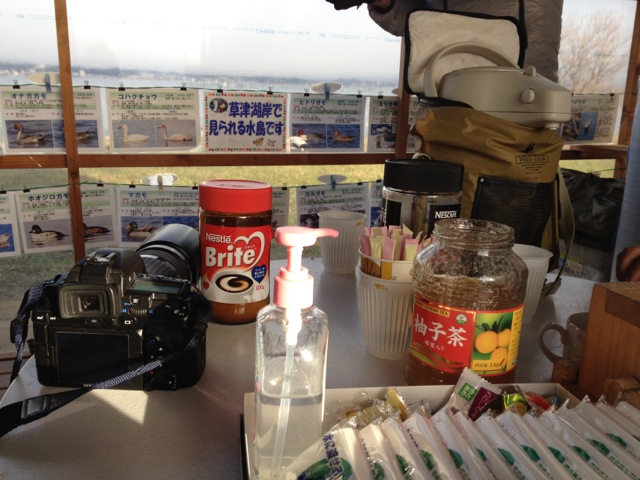 湖北には彼らのねぐらのひとつがあるのですが、そこは国道沿いの沼のような閑散としたところだったのですが、今日行った所は公園になっていてコハクチョウ保護のボランティアの方達が観察小屋を設置してくれていて、そこで無料で暖かい飲み物やお菓子が頂けました。